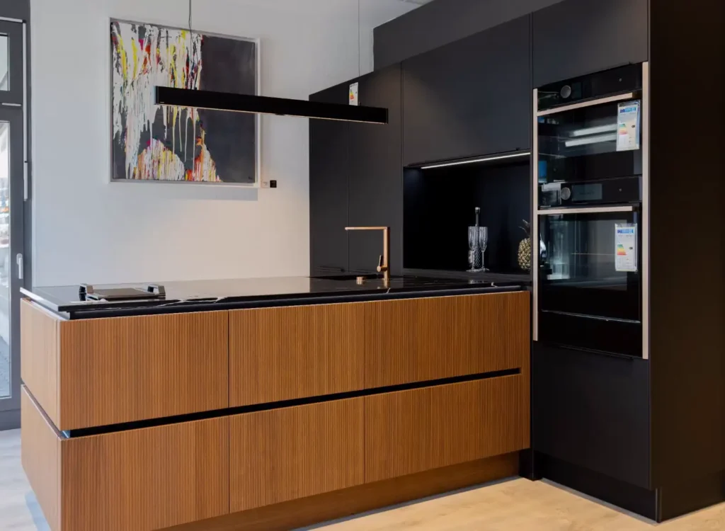 Ausstellungsküche Nussbaum – Designküche mit NEFF Geräten im Abverkauf | Karlsruhe