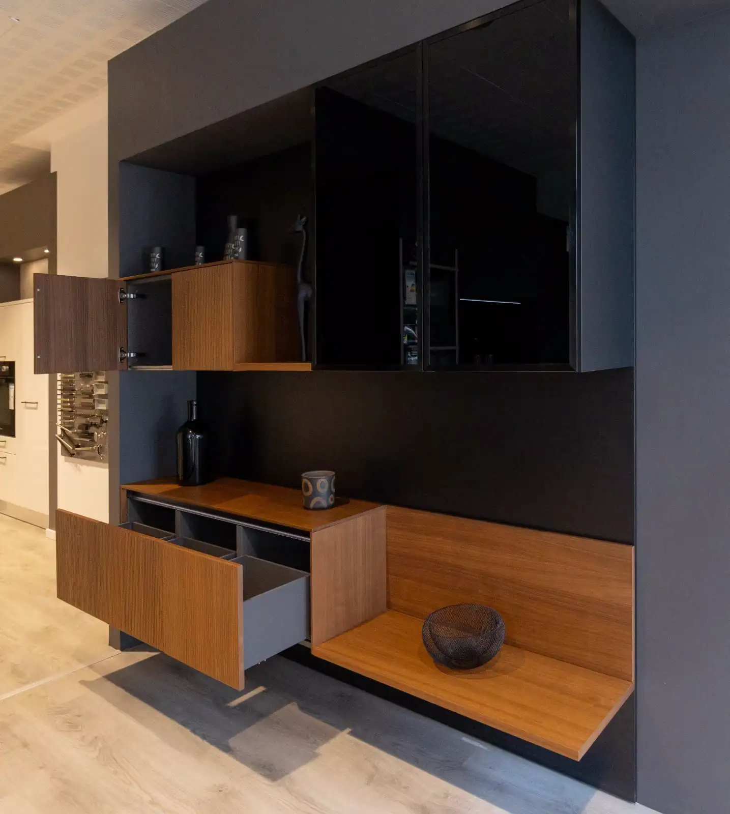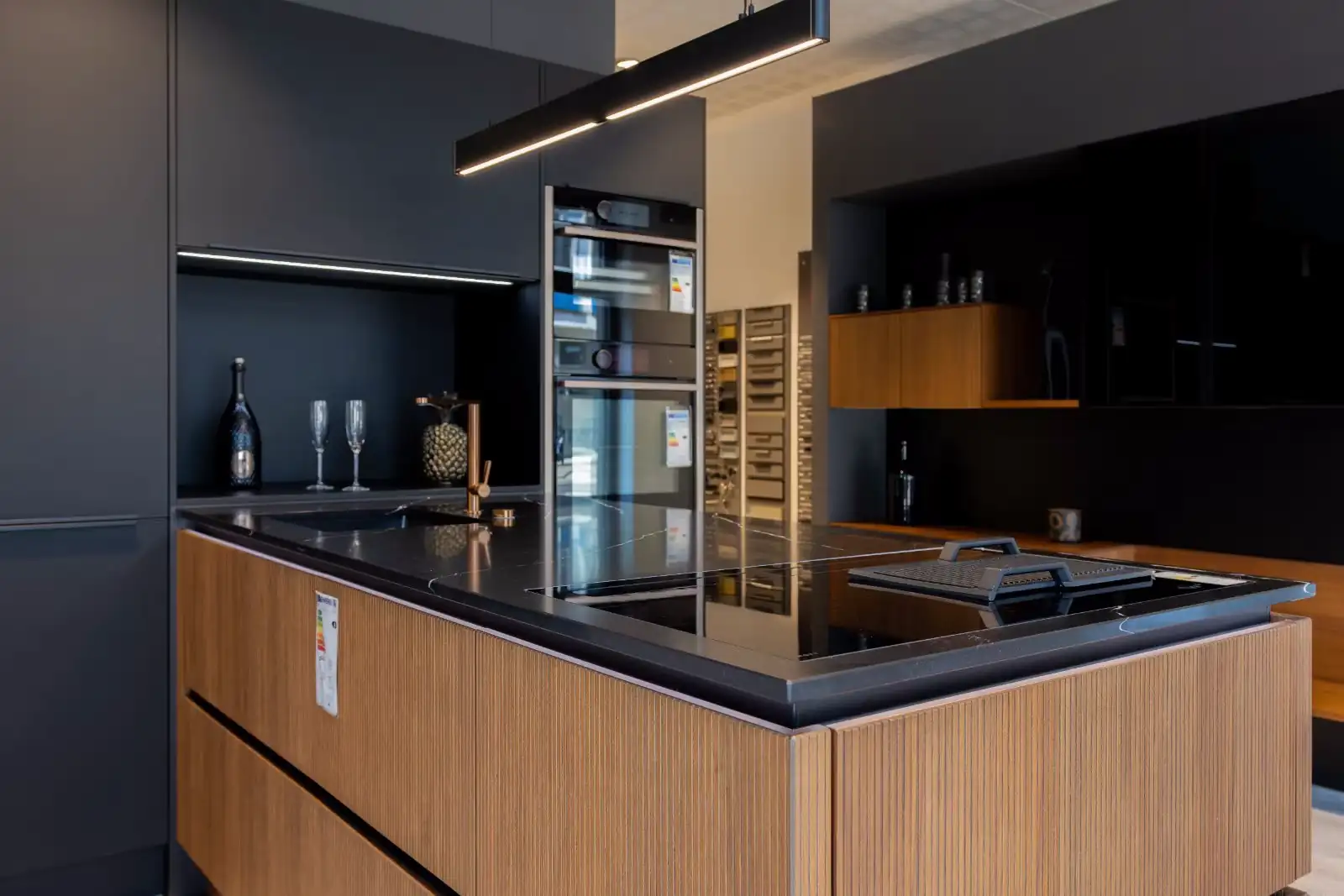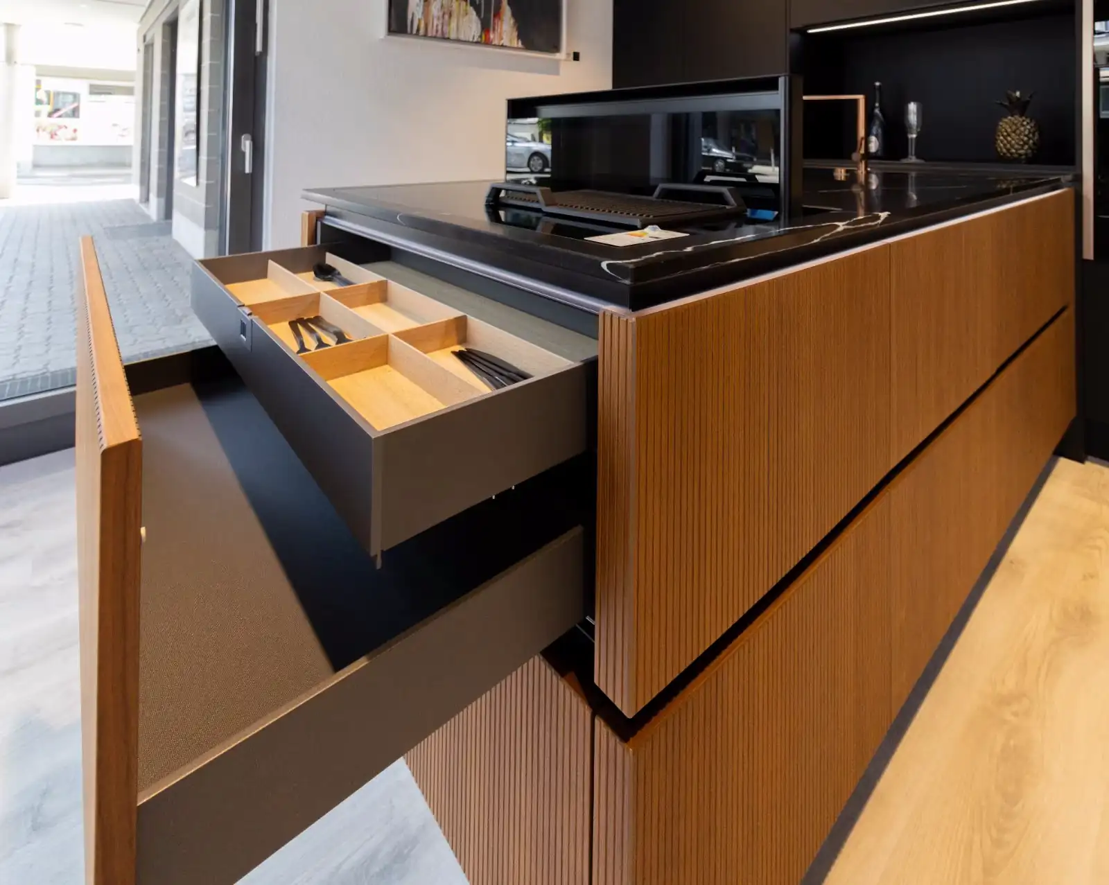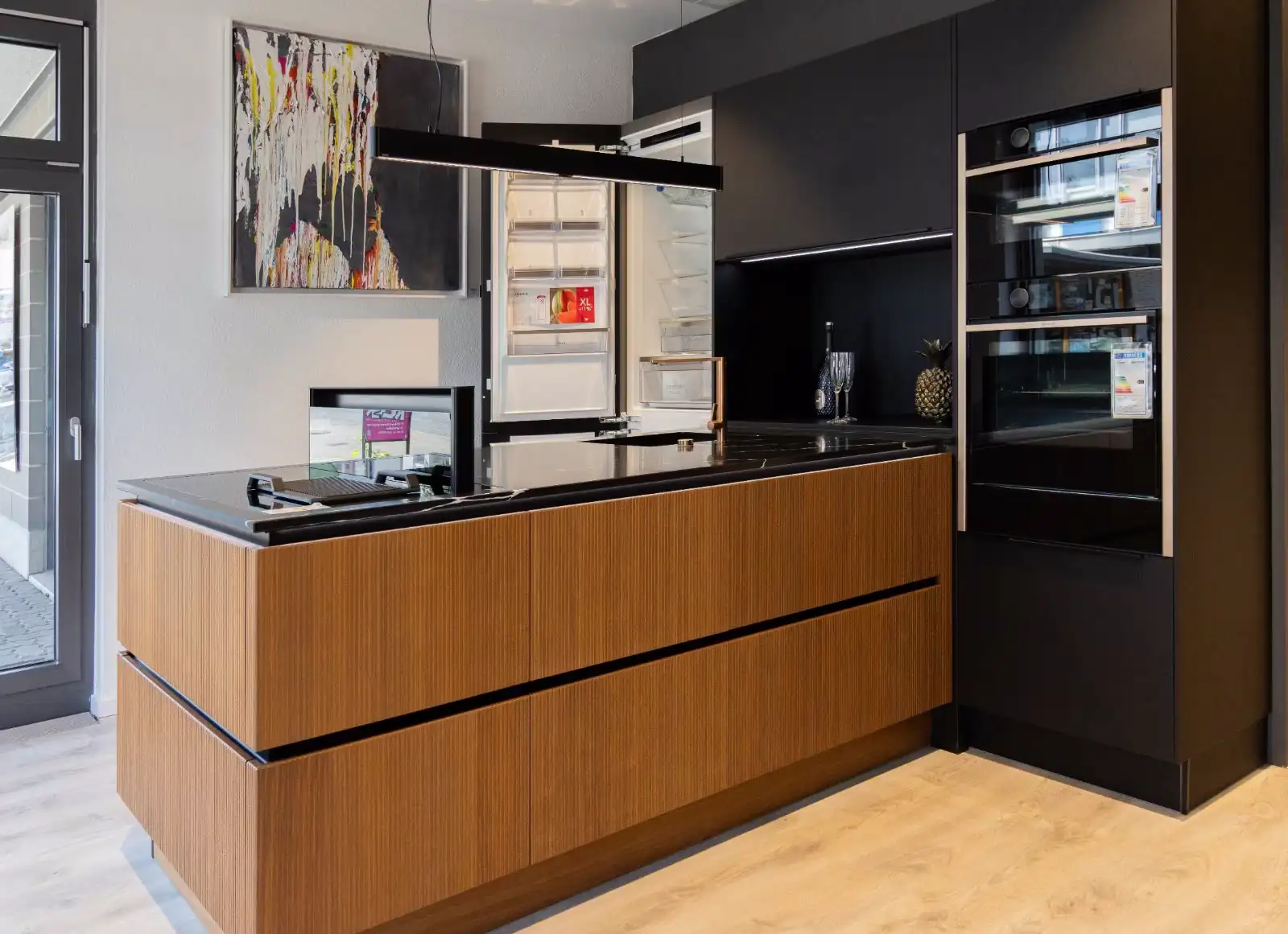 Die Kombination aus echtem Nussbaumfurnier mit vertikaler Rillung und tiefmatten Schwarzlack-Fronten (AV2135) macht diese Küche zu einem zeitlosen Statement.