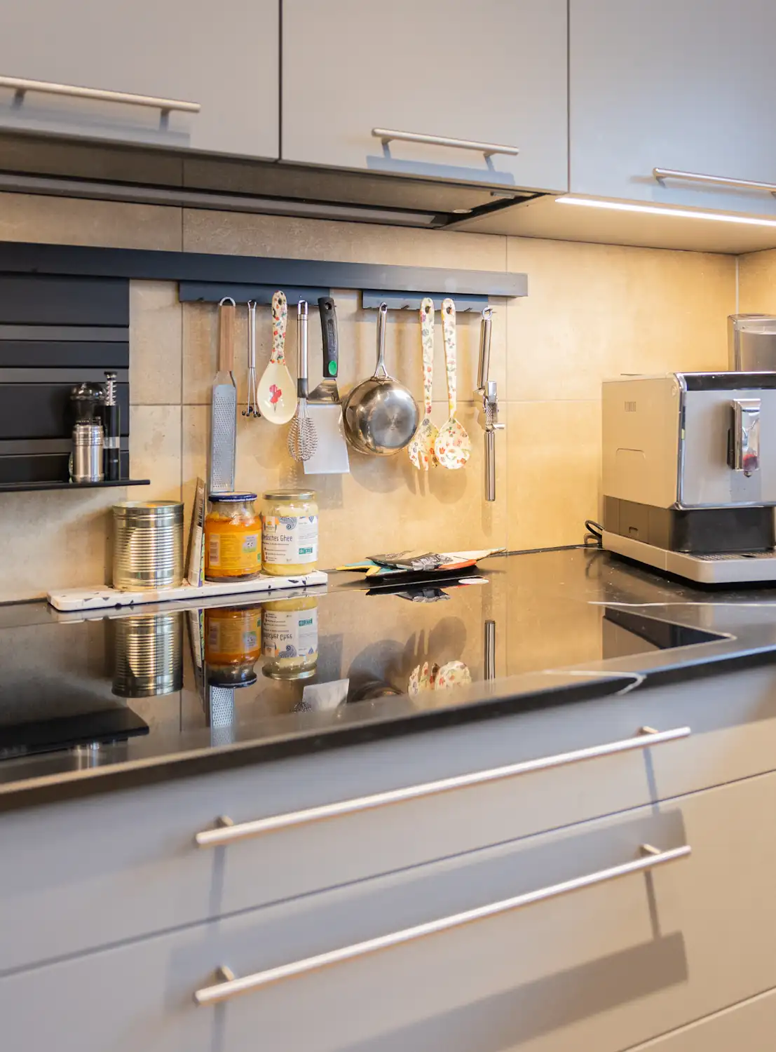 Das Highlight der Technik ist das Novy Panorama Induktionskochfeld, das in diesem Projekt mit einem Dunstabzug im Hängeschrank gekoppelt ist. Die Absaugung arbeitet effektiv, leise und optisch unauffällig – perfekt integriert in das schlichte Küchendesign.