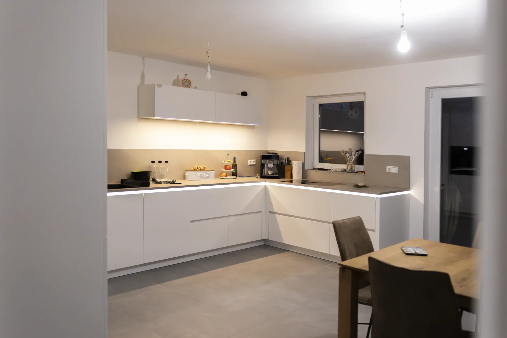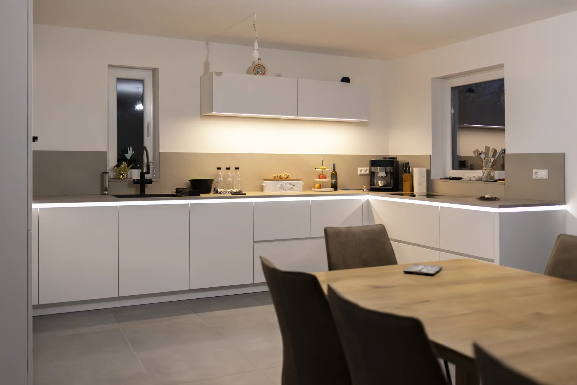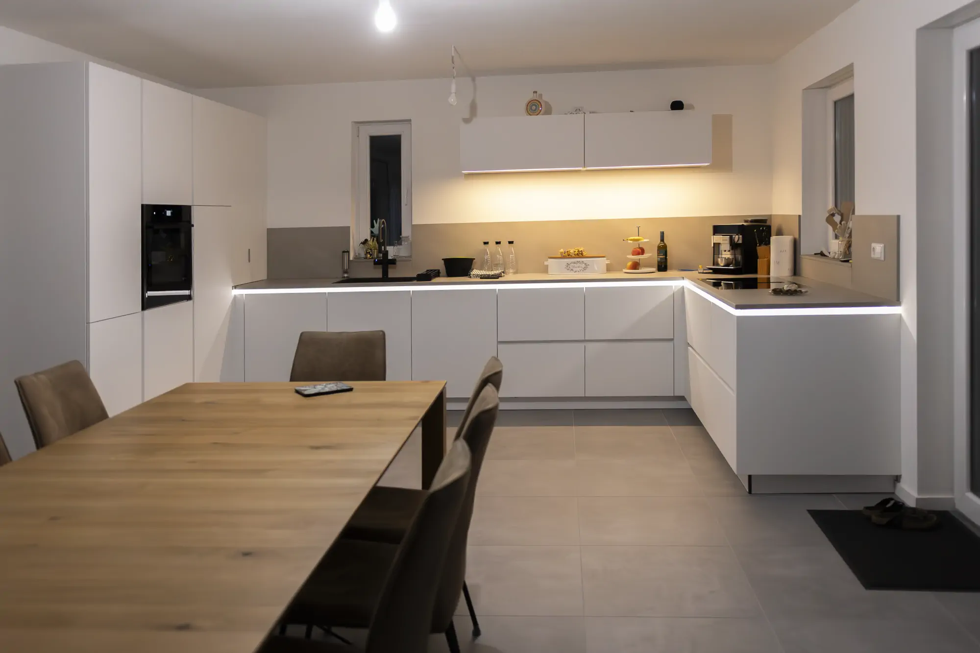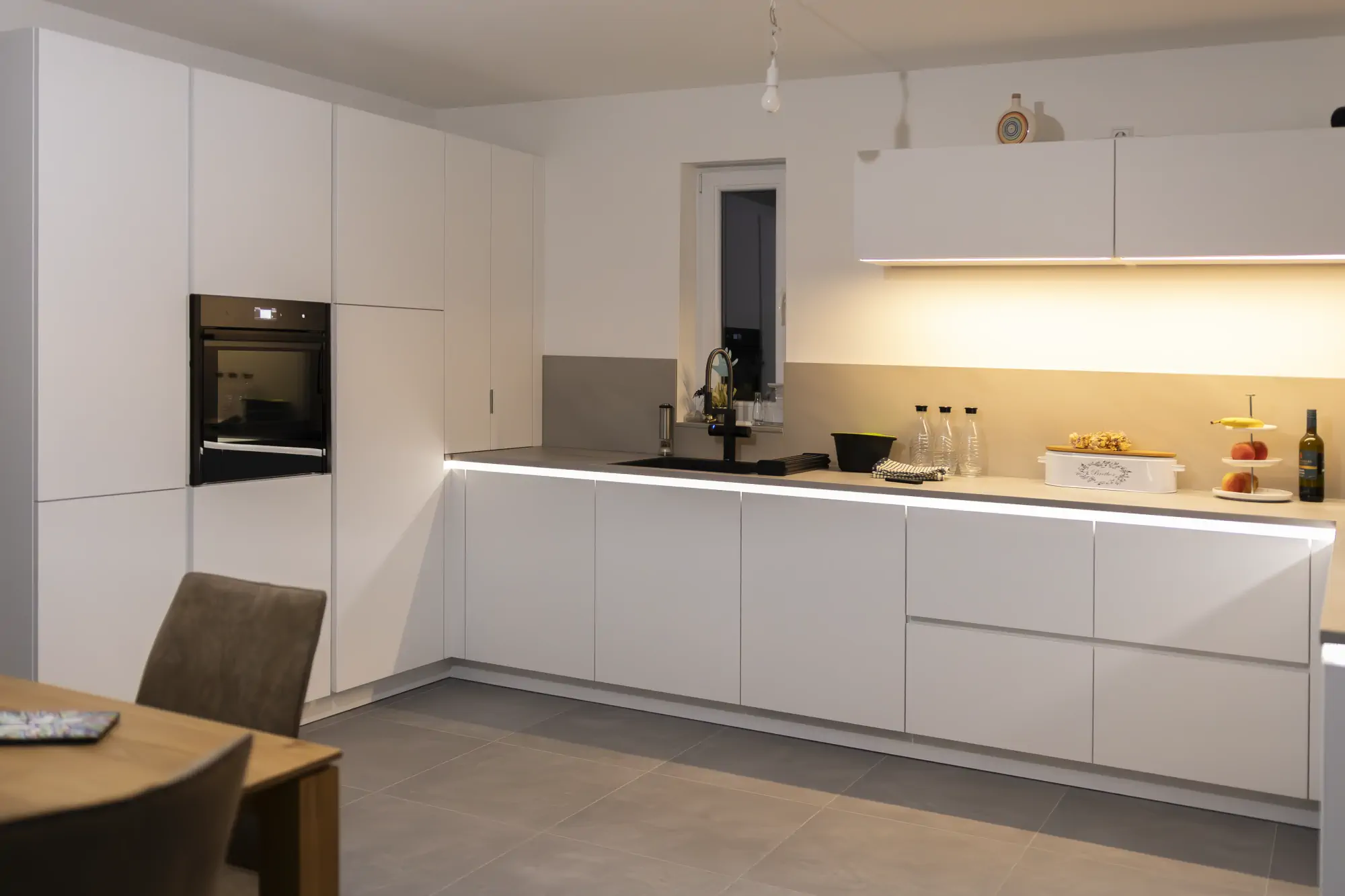 Die Ausstattung wurde bewusst modern gewählt. Neff Backofen mit Dampfunterstützung und SlideHide, ein Kochfeld mit integriertem Abzug und TwistPad sowie Blanco Choice fügen sich harmonisch in das Gesamtbild ein. Besonders praktisch ist der Aufsatzschrank mit Falttür, in dem Kleingeräte griffbereit und gleichzeitig unsichtbar verstaut sind. Das Lichtkonzept mit LED in der Gola-Schiene und einer klaren Linienbeleuchtung unter dem Hänger gibt der Küche zusätzliche Tiefe und Atmosphäre.